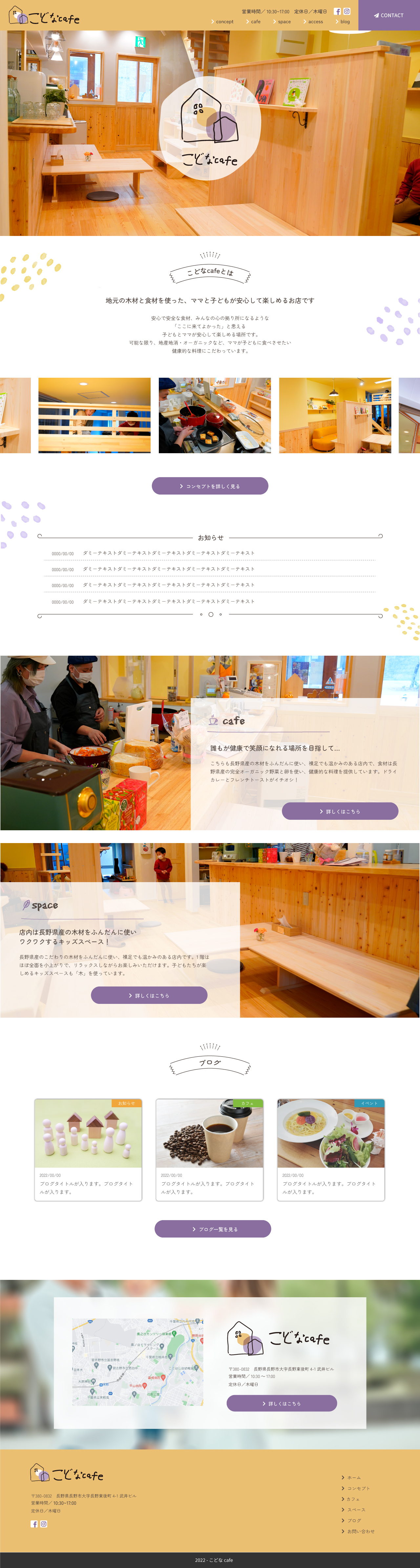 | ABOUT | 長野市善行寺のママと子どもが安心して楽しめるオーガニックカフェ「こどなcafe」のホームページ制作を担当させていただきました。 地元の木材と食材を使って地産地消・オーガニックなど、健康的な料理にこだわっていて、内装も全て安全な木材を使用している素敵なcafeです。 |