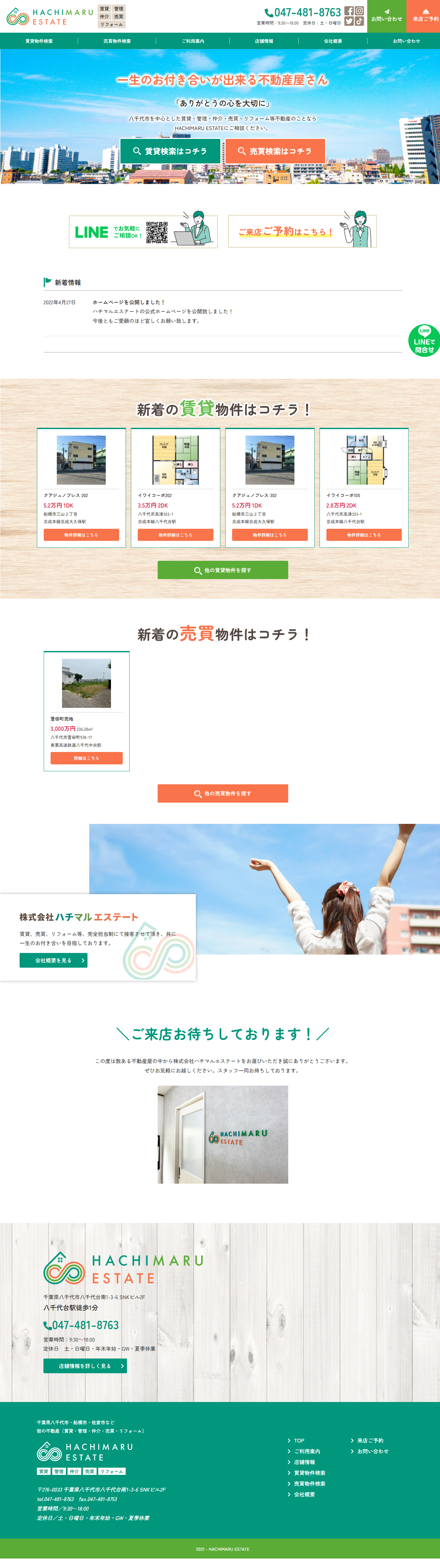 | ABOUT | 千葉県八千代市を中心とした不動産屋さん、株式会社ハチマルエステート様のホームページ制作を担当させていただきました。ありがとうの心を大切にしている、人に寄り添った不動産屋さんです。 |
