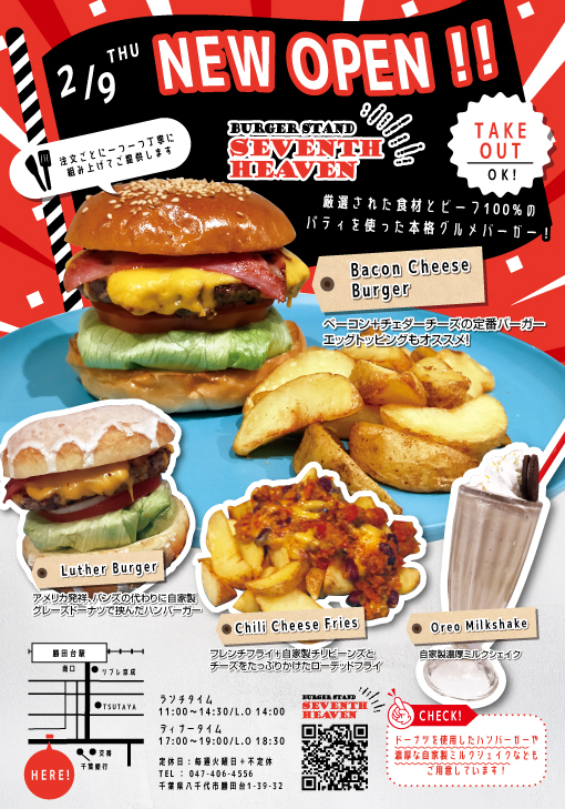 | ABOUT | 2023年2月に千葉県八千代市勝田台にオープンしたハンバーガー屋「SEVENTH HEAVEN」様のオープン告知用のチラシ制作を担当させていただきました。 |