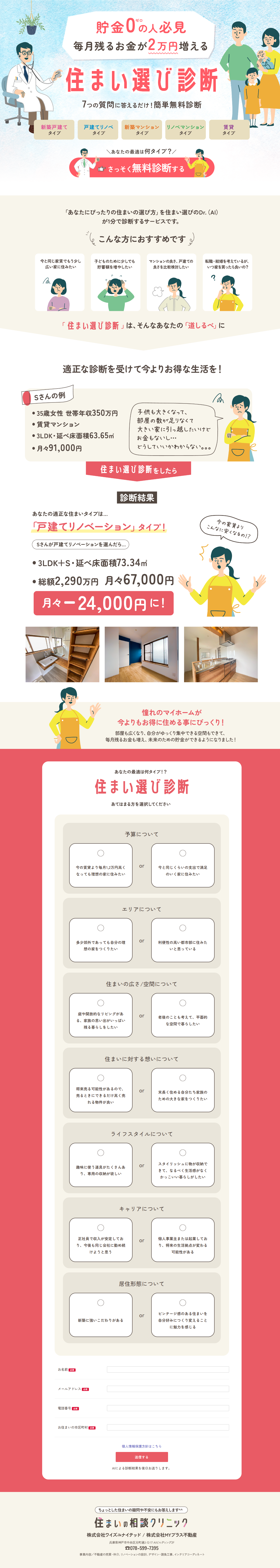 | DESIGN POINT | SNS広告を活用した、診断LPのデザインを担当させていただきました。柔らかい印象と、メリハリをつけたデザインで、興味をもってもらえるようなレイアウトです。 |