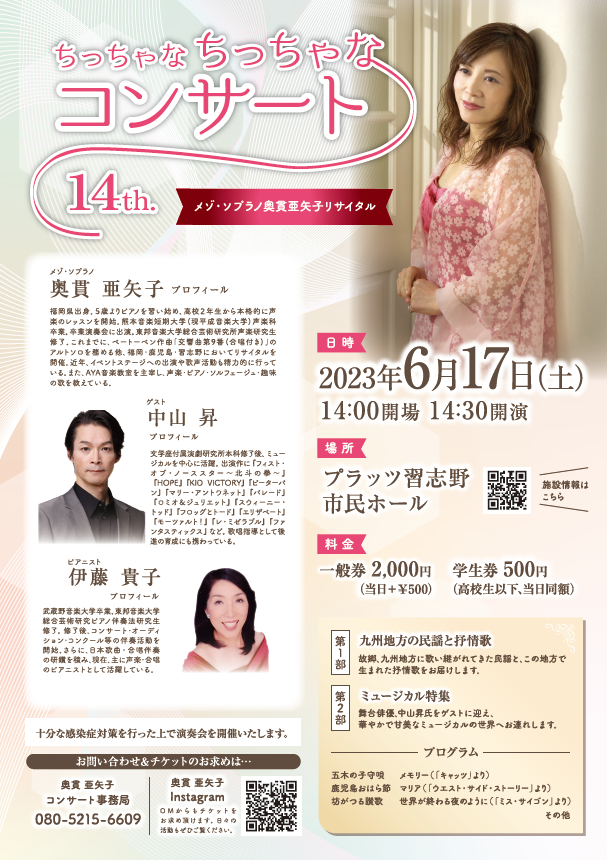 ABOUT福岡県ご出身で、これまでにベートーベン作曲「交響曲第9番(合唱付き)」のアルトソロを務める他、福岡・鹿児島・習志野においてリサイタルを開催され、近年、イベントステージへの出演や歌声活動も精力的に行っていらっしゃいる奥貫亜矢子様のコンサートのチラシ制作を担当させていただきました。