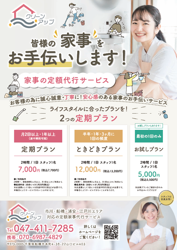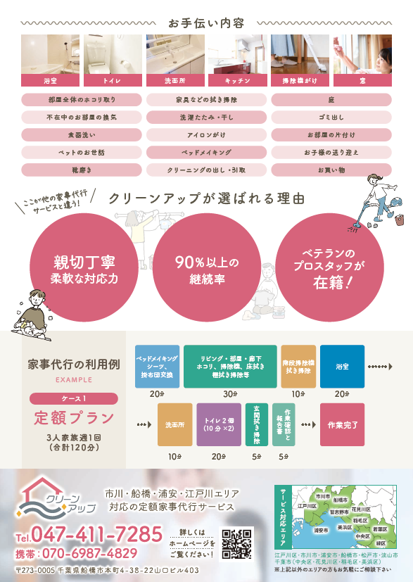 | ABOUT | 千葉県市川市・船橋市・浦安市・千葉市、東京都江戸川区エリアを対応する定額家事代行サービスを提供しているクリーンアップ様のホームページ制作を担当させていただきました。ライフスタイルに合った2つのプランを提供している企業様です。 |