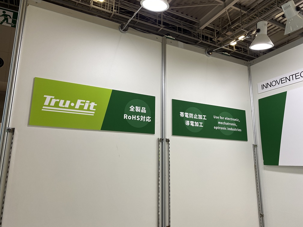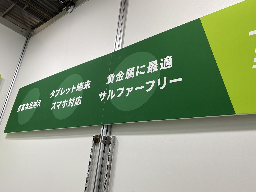 DESIGN POINTロゴがひとめでみられるよう、また、展示品の配置にあうようにパネルのサイズからご提案させていただきました。くっきりとみやすいブースを意識しています。